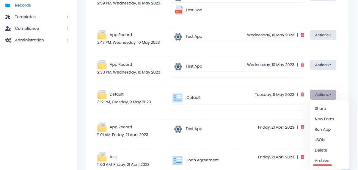 Allow a user to Archive a Record, Record Matter and Record Matter Item from the Actions Menu.